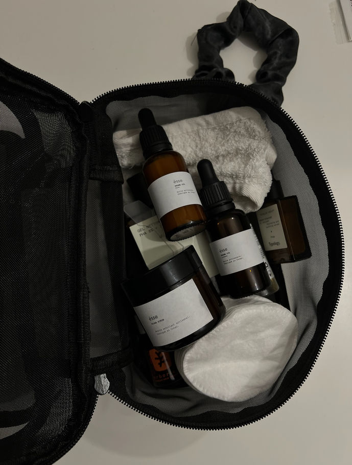 Le kit ēsse comprend 4 produits emballés dans le puffy bag ēsse : Scrub, Intense, Pure, Cream.
